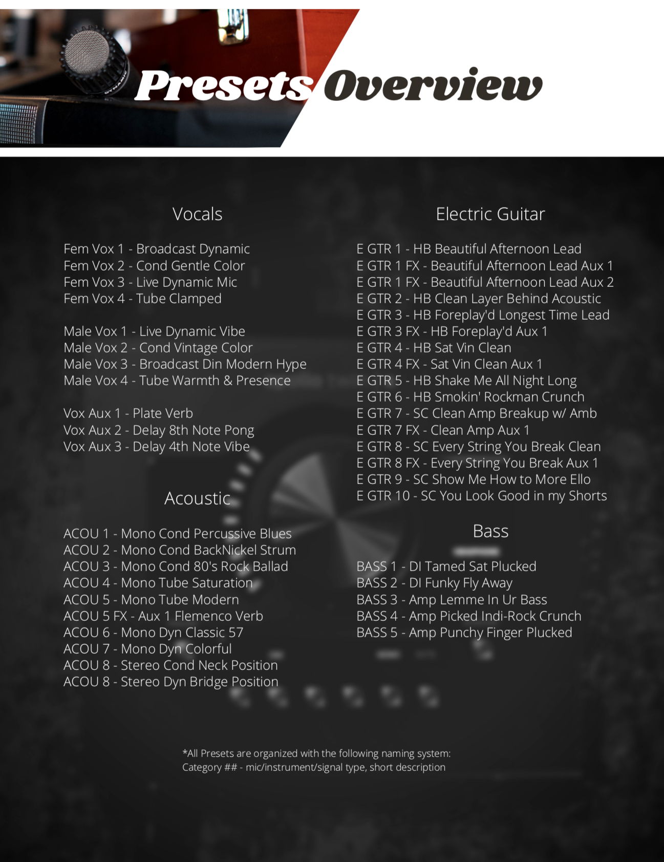 This preset pack comes with 31 main presets across Acoustic & Electric guitar, Bass, & Vocals. Complete with flexible effects routing, you will have timeless sounds good for all genreʼs of music. The ultimate starting point for engineers, artists, & songwriters.